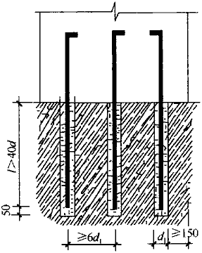 8.6.1 岩石锚杆基础适用于直接建在基岩上的柱基,以及承受拉力或水平力较大的建筑物基础。锚杆基础应与基岩连成整体,并应符合下列要求: