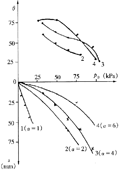 室内模型试验:硬层为标准砂,e=0.66,Es=11.6MPa~14.8MPa;下卧软层分别选用流塑状粉质黏土,变形模量在4MPa左右;淤泥质土变形模量为2.5MPa左右。从载荷试验曲线上很难找到这两类土的比例界线值,见图6,曲线1流塑状粉质黏土s=5Omm时的强度仅20kPa。作为双层地基,当α=2,s=50mm时的强度为56kPa(曲线2),α=4时为70kPa(曲线3),α=6时为96kPa(曲线4)。虽然按同一下沉量来确定强度是欠妥的,但可反映垫层的扩散作用,说明θ值愈大,压力扩散的效果愈显著。