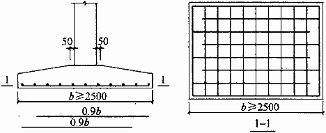 5 当柱下钢筋混凝土独立基础的边长和墙下钢筋混凝土条形基础的宽度大于或等于2.5m时,底板受力钢筋的长度可取边长或宽度的0.9倍,并宜交错布置(图8.2.1-1)。
