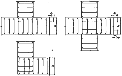 6 钢筋混凝土条形基础底板在T形及十字形交接处,底板横向受力钢筋仅沿一个主要受力方向通长布置,另一方向的横向受力钢筋可布置到主要受力方向底板宽度1/4处(图8.2.1-2)。在拐角处底板横向受力钢筋应沿两个方向布置(图8.2.1-2)。