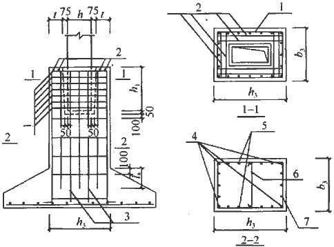 1—杯口壁内横向箍筋ф8@150;2—顶层焊接钢筋网;3—插入基础底部的纵向钢筋不应少于每米1根;4—短柱四角钢筋一般不小于 ф 20;5—短柱长边纵向钢筋当h3≤1000用ф12@300,当h3>1000用16@300;6—按构造要求;7—短柱短边纵向钢筋每边不小于0.05%b3h3(不小于ф12@300)