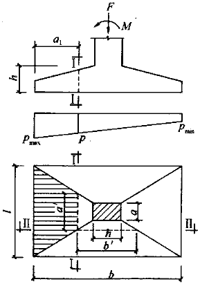 8.2.11 在轴心荷载或单向偏心荷载作用下,当台阶的宽高比小于或等于2.5且偏心距小于或等于1/6基础宽度时,柱下矩形独立基础任意截面的底板弯矩可按下列简化方法进行计算(图8.2.11):