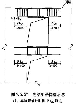 3 顶层连梁纵向水平钢筋伸入墙肢的长度范围内应配置箍筋,箍筋间距不宜大于150mm,直径应与该连梁的箍筋直径相同。