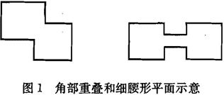 角部重叠和细腰形的平面图形(图1),在中央部位形成狭窄部分,在地震中容易产生震害,尤其在凹角部位,因为应力集中容易使楼板开裂、破坏,不宜采用。如采用,这些部位应采取加大楼板厚度、增加板内配筋、设置集中配筋的边梁、配置45°斜向钢筋等方法予以加强。