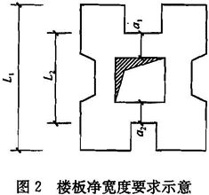 楼板有较大凹入或开有大面积洞口后,被凹口或洞口划分开的各部分之间的连接较为薄弱,在地震中容易相对振动而使削弱部位产生震害,因此对凹入或洞口的大小加以限制。设计中应同时满足本条规定的各项要求。以图2所示平面为例,L2不宜小于0.5L1,a1与a2之和不宜小于0.5L2且不宜小于5m,a1和a2均不应小于2m,开洞面积不宜大于楼面面积的30%。