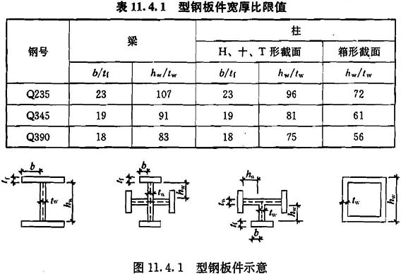 11.4.1 型钢混凝土构件中型钢板件(图11.4.1)的宽厚比不宜超过表11.4.1的规定。