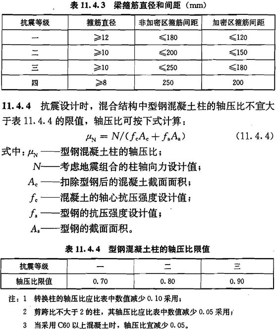 4 抗震设计时,柱箍筋的直径和间距应符合表11.4.6的规定,加密区箍筋最小体积配箍率尚应符合式(11.4.6)的要求,非加密区箍筋最小体积配箍率不应小于加密区箍筋最小体积配箍率的一半;对剪跨比不大于2的柱,其箍筋体积配箍率尚不应小于1.0%,9度抗震设计时尚不应小于1.3%。