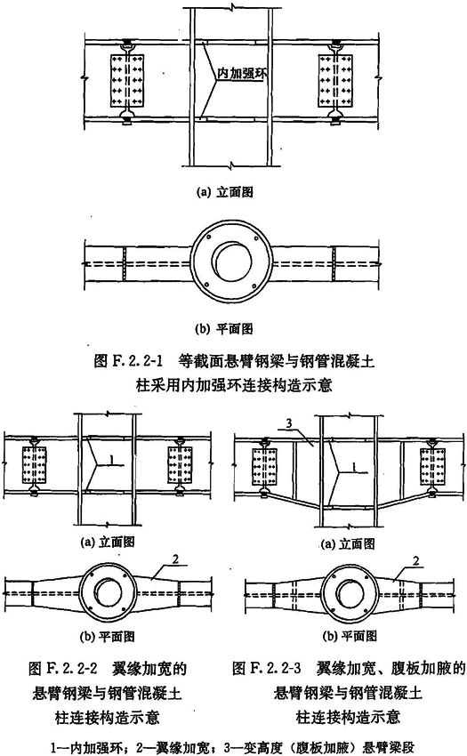 F.2.2 钢管混凝土柱的直径较大时,钢梁与钢管混凝土柱之间可采用内加强环连接。内加强环与钢管内壁应采用全熔透坡口焊缝连接。梁与柱可采用现场直接连接,也可与带有悬臂梁段的柱在现场进行梁的拼接。悬臂梁段可采用等截面(图F.2.2-1)或变截面(图F.2.2-2、图F.2.2-3);采用变截面梁段时,其坡度不宜大于1/6。