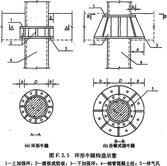 F.2.5 环形牛腿、台锥式环形深牛腿可由呈放射状均匀分布的肋板和上、下加强环组成(图F.2.5)。肋板应与钢管壁外表面及上、下加强环采用角焊缝焊接,上、下加强环可分别与钢管壁外表面采用角焊缝焊接。环形牛腿的上、下加强环以及台锥式深牛腿的下加强环应预留直径不小于50mm的排气孔。