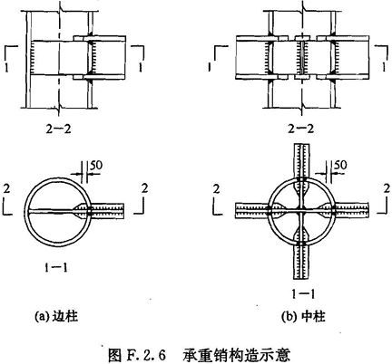 F.2.6 钢管混凝土柱的外径不小于600mm时,可采用承重销传递剪力。由穿心腹板和上、下翼缘板组成的承重销(图F.2.6),其截面高度宜取框架梁截面高度的50%,其平面位置应根据框架梁的位置确定。翼缘板在穿过钢管壁不少于50mm后可逐渐收窄。钢管与翼缘板之间、钢管与穿心腹板之间应采用全熔透坡口焊缝焊接,穿心腹板与对面的钢管壁之间(图F.2.6a)或与另一方向的穿心腹板之间(图F.2.6b)应采用角焊缝焊接。