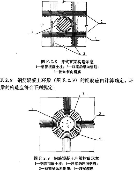 F.2.7 钢筋混凝土梁与钢管混凝土柱的管外弯矩传递可采用井式双梁、环梁、穿筋单梁和变宽度梁,也可采用其他符合受力分析要求的连接方式。