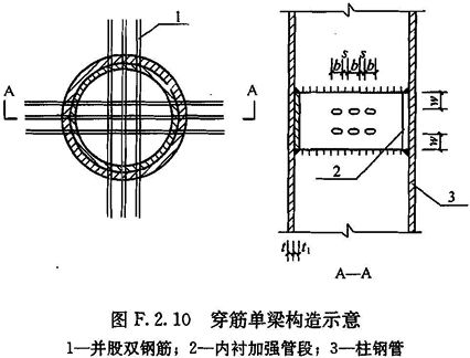 F.2.10 采用穿筋单梁构造(图F.2.10)时,在钢管开孔的区段应采用内衬管段或外套管段与钢管壁紧贴焊接,衬(套)管的壁厚不应小于钢管的壁厚,穿筋孔的环向净矩s不应小于孔的长径b,衬(套)管端面至孔边的净距w不应小于孔长径b的2.5倍。宜采用双筋并股穿孔(图F.2.10)。