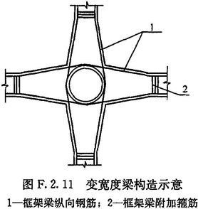 F.2.11 钢管直径较小或梁宽较大时,可采用梁端加宽的变宽度梁传递管外弯矩的构造方式(图F.2.11)。变宽度梁一个方向的2根纵向钢筋可穿过钢管,其余纵向钢筋可连续绕过钢管,绕筋的斜度不应大于1/6,并应在梁变宽度处设置附加箍筋。