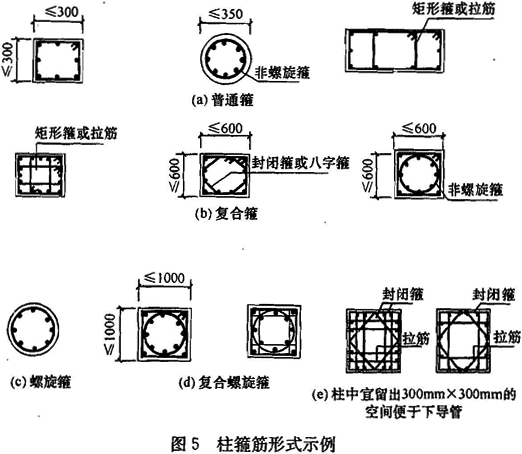 本条给出的箍筋最小配箍特征值,除与柱抗震等级和轴压比有关外,还与箍筋形式有关。井式复合箍、螺旋箍、复合螺旋箍、连续复合螺旋箍对混凝土具有更好的约束性能,因此其配箍特征值可比普通箍、复合箍低一些。本条所提到的柱箍筋形式举例如图5所示。