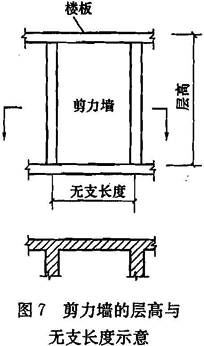 设计人员可利用计算机软件进行墙体稳定验算,可按设计经验、轴压比限值及本条2、3、4款初步选定剪力墙的厚度,也可参考02规程的规定进行初选:一、二级剪力墙底部加强部位可选层高或无支长度(图7)二者较小值的1/16,其他部位为层高或剪力墙无支长度二者较小值的1/20;三、四级剪力墙底部加强部位可选层高或无支长度二者较小值的1/20,其他部位为层高或剪力墙无支长度二者较小值的1/25。