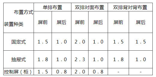 4.7.4 成排布置的配电屏,其屏前和屏后的通道净宽不应小于表4.7.4的规定。