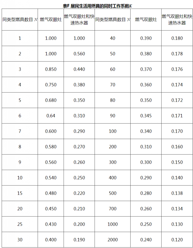 注:1 表中“燃气双眼灶”是指一户居民装设一个双眼灶的同时工作系数;当每一户居民装设两个单眼灶时,也可参照本表计算。