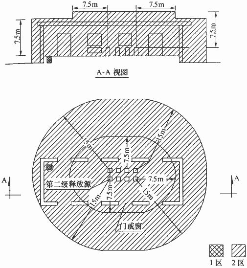 建筑物内部及建筑物外壁4.5m内,屋顶(以放散管管口计)以上7.5m内的范围为2区。