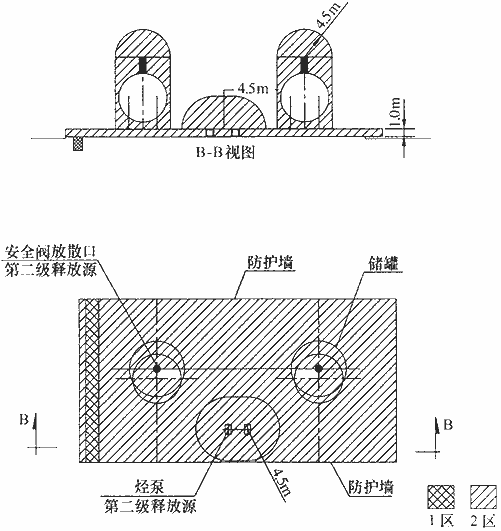 1 以储罐安全阀放散管管口为中心,半径为4.5m,以及至地面以上的范围内和储罐区防护墙以内,防护墙顶部以下的空间划为2区;