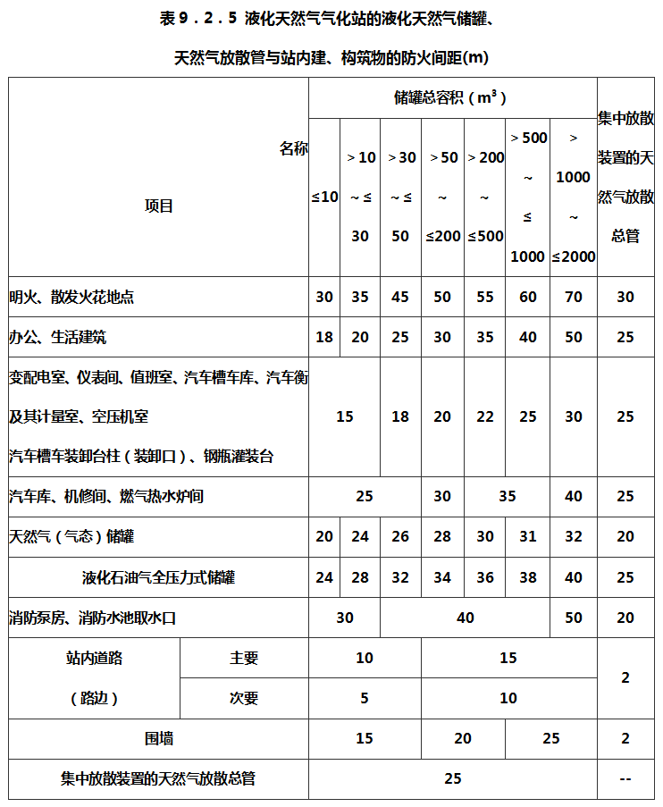 9.2.5 液化天然气气化站的液化天然气储罐、集中放散装置的天然气放散总管与站内建、构筑物的防火间距不应小于表9.2.5的规定。
