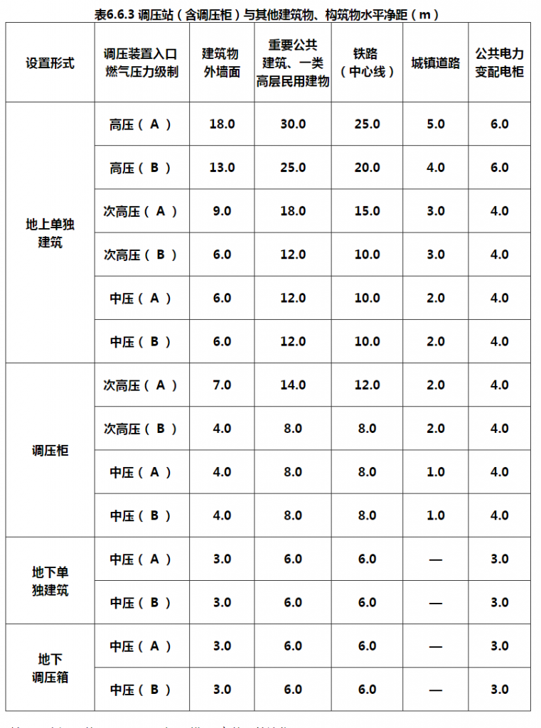 6.6.3 调压站(含调压柜)与其他建筑物、构筑物的水平净距应符合表6.6.3的规定。