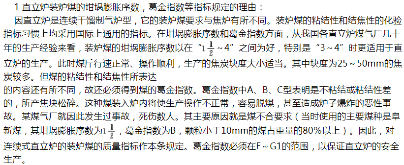 直立炉所产的煤气及气焦的产率与挥发分、水分、灰分、煤的粒度及操作条件有关,条文中所规定各项指标也都是根据历年生产统计资料制定的。