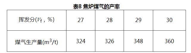 根据一些焦化厂的生产统计数据证明:当配煤挥发分在“28%~30%”时,煤气发生量平均值为“345m3/t”。但南方一些煤气厂和焦化厂操作条件有所不同,即使在配煤情况相近时,煤气发生量也不相同,因此只能规定其波动范围(见表8)。