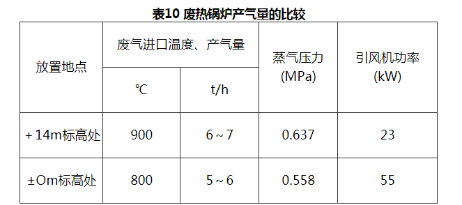 4.2.17 废热锅炉的设置地点与锅炉的出力有很大关系。同样形式的两台废热锅炉由于安装高度不一样,结果在产气量上有明显差别(见表10)。