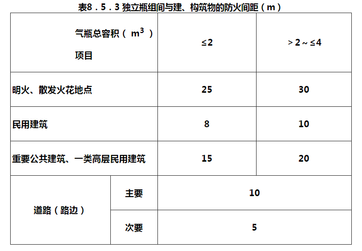 独立瓶组间与建、构筑物的防火间距不应小于表8.5.3的规定。