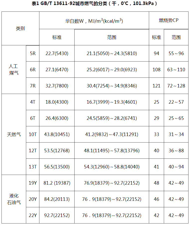 现行的国家标准《城市燃气分类》GB/T 13611,详见表1(华白数按燃气高发热量计算)。