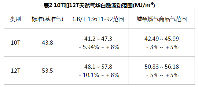 以常见的天然气10T和12T为例(相当于国际联盟标准的L类和H类),其成分主要由甲烷和少量惰性气体组成,燃烧特性比较类似,一般可用单一参数(华白数)判定其互换性。表1中所列华白数的范围是指GB/T 13611-92规定的最大允许波动范围,但作为商品天然气供给作城镇燃气时,应适当留有余地,参考英国规定,是留有3%~5%的余量,则10T和12T作城镇燃气商品气时华白数波动范围如表2,可作为确定商品气波动范围的参考。
