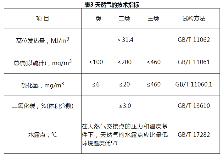 1 天然气的质量技术指标国家现行标准《天然气》GB 17820-1999的一类气或二类气的规定,详见表3。
