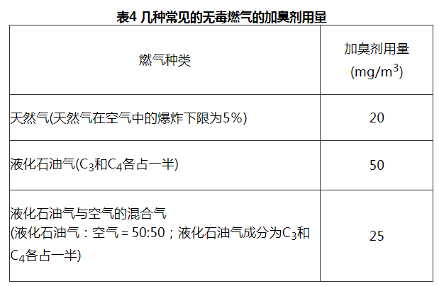 根据上述国内外加臭剂用量情况,对于爆炸下限为5%的天然气,取加臭剂用量不宜小于20mg/m3。并以此作为推论,当不具备试验条件时,对于几种常见的无毒燃气,在空气中达到爆炸下限的20%时应能察觉的加臭用量,不宜小于表4的规定,可做确定加臭剂用量的参考。
