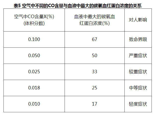 从表5可以看到,采用空气中CO含量0.025%为标准,达到平衡时人体血液中碳氧血红蛋白最高只能到33%,对人一般只能产生头痛、视力模糊、恶心等,不会产生严重症状。据此可理解为,空气中CO含量0.025%作为燃气加臭理论的“允许的有害浓度”标准,在实际操作运行中,还应留有安全余量,本规范推荐采用0.02%。
