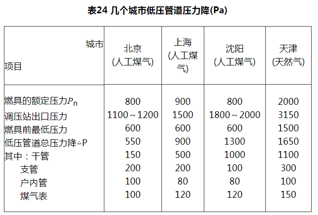 1 国内几个有代表性城市低压燃气管道计算压力降的情况见表24。燃具额定压力Pn为800Pa时,燃具前的最低压力为600Pa,约为Pn的600/800=75%。低压管道总压力降取值:北京较低、沈阳较高、上海居中。这有种种原因,如北京为1958年开始建设的,对今后的发展留有较大余地;又如沈阳是沿用旧的管网,由于用户在不断的增加,要求不断提高输气能力,不得不把调压站出口压力向上提,这是迫不得已采取的一种措施;上海市的情况界于上述两城市之间,其压力降为900Pa,约为Pn的1.0倍。