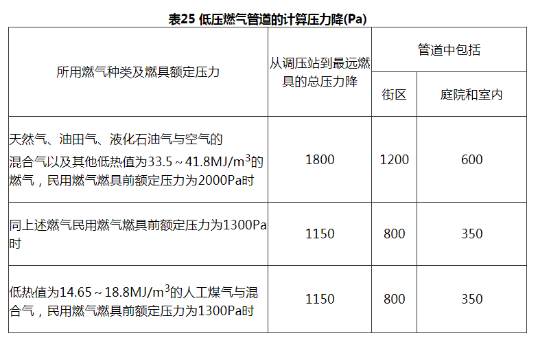 2 原苏联建筑法规《燃气供应、室内外燃气设备设计规范》对低压燃气管道的计算压力降规定如表25,其总压力降约为燃具额定压力的90%。