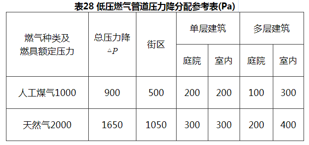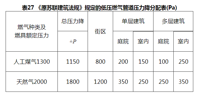 6 应当补充说明的是,本条所给出的只是低压燃气管道的总压力降,至于其在街区干管、庭院管和室内管中的分配,还应根据情况进行技术经济分析比较后确定。作为参考,现将原苏联建筑法规推荐的数值列如表27。