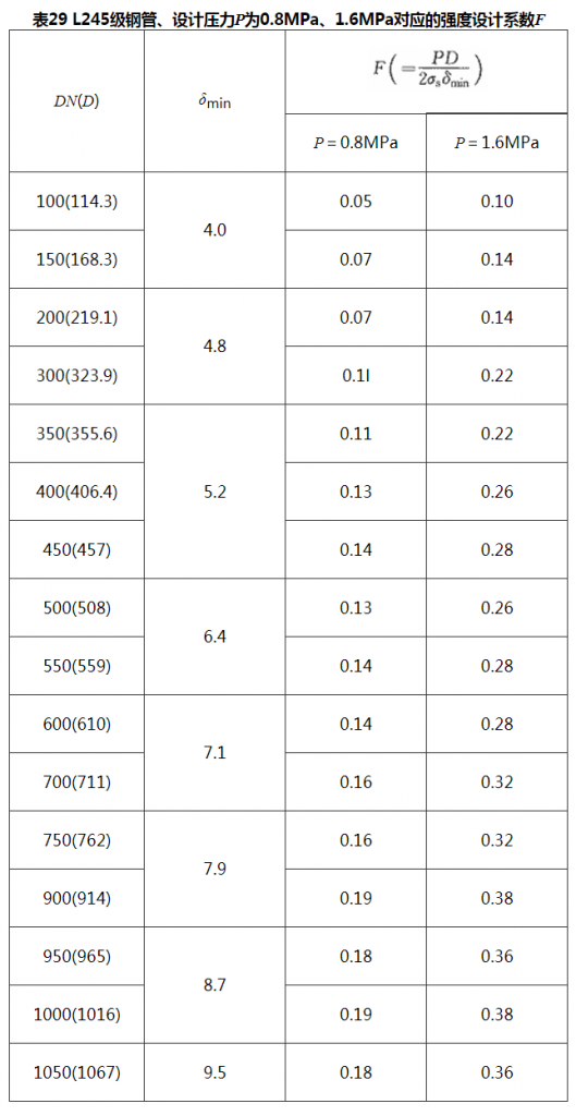 最小公称壁厚是考虑满足管道在搬运和挖沟过程中所需的刚度和强度要求,这是参照钢管标准和有关国内外标准确定的,并且该厚度能满足在输送压力0.8MPa,强度系数不大于0.3时的计算厚度要求。例如在设计压力为0.8MPa,选用L245级钢管时,对应DN100~1050最小公称壁厚的强度设计系数为0.05~0.19。详见表29。