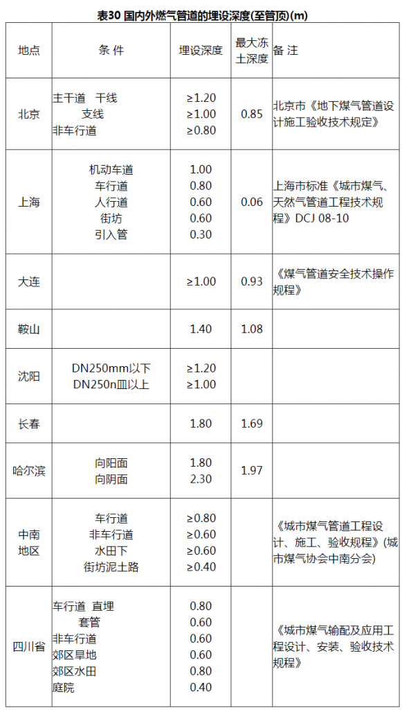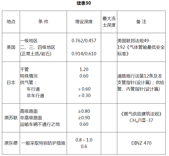 按我国铸铁管的技术标准进行验算,条文中所规定的覆土深度,对于一般管径的铸铁管,其强度都是能适应的。如上海地区在车行道下最小覆土深度为0.8m的铸铁管,经长期的实践运行考验,情况良好。此次修编中将埋在车行道下的最小覆土深度由0.8m改为0.9m,主要是考虑到今后车行道上的荷载将会有所增加。对埋设在庭院内地下燃气管道的深度同埋设在非车行道下的燃气管道深度早先的规定是均不能小于0.6m。但在我国土壤冰冻线较浅的南方地区,埋设在街坊内泥土下的小口径管道(指口径50mm以下的)的覆土厚度一般为0.30m,这个深度同时也满足砌筑排水明沟的要求,参照中南地区、上海市煤气公司与四川省城市煤气设计施工规程,在修订中增加了对埋设在机动车不可能到达地方的地下燃气管道覆土厚度为0.3m的规定,以节约工程投资。“机动车道”或“非机动车道”分别是指机动车能或不能通行的道路,这对于城市道路是容易区分的,对于居民住宅区内道路,按如下区分掌握:如果是机动车以正常行驶速度通行的主要道路则属于机动车道;住宅区内由上述主要道路到住宅楼门之间的次要道路,机动车只是缓行进入或停放的,可视为非机动车道。目前国内外有关燃气管道埋设深度的规定如表30所示。