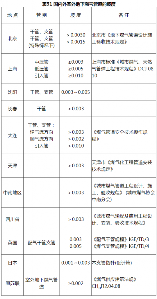 为了排除管内燃气冷凝水,要求管道保持一定的坡度。国内外有关燃气管道坡度的规定如表31,地下燃气管道的坡度国内外一般所采用的数值大部分都不小于0.003。但在很多旧城市中的地下管一般都比较密集,往往有时无法按规定坡度敷设,在这种情况下允许局部管段坡度采取小于0.003的数值,故本条规范用词为“不宜”。