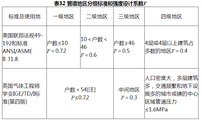 几个国家和地区管道地区分级标准和强度设计系数F详见表32。
