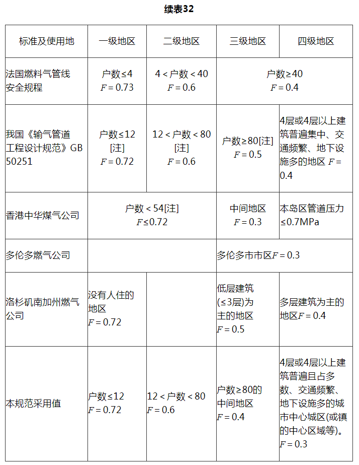 6.4.8 强度设计系数F,根据管道所在地区等级不同而不同。并根据各国国情(如地理环境、人口等)其取值也有所不同。几个国家管道地区分级标准和强度设计系数F的取值情况详见表32。