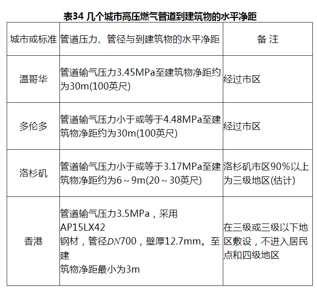第6.4.15条中高压A燃气管道到建筑物的水平净距30m是参考温哥华、多伦多市的规定确定的。几个城市高压燃气管道到建筑物的净距见表34。