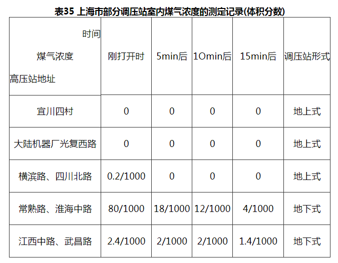原上海市煤气公司曾用“臭敏检漏仪”对调压站室内煤气(人工煤气)浓度进行测定,在正常情况下(通风换气为每小时2次),地上调压站室内空气中的煤气含量是极少的,详见表35。