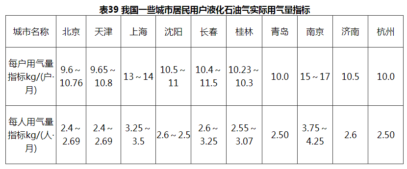 我国一些城市居民用户液化石油气实际用气量指标见表39。