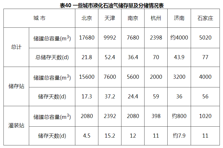 一些城市液化石油气储存量及分储情况见表40。