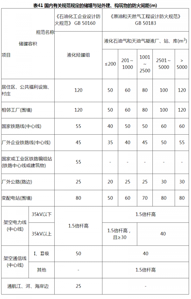 2)国内其他有关规范规定的液化石油气储罐与站外建、构筑物之间的防火间距见表41。
