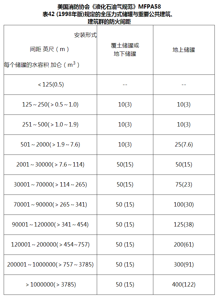 美国国家消防协会《液化石油气规范》NFPA58(1998年版)规定的储罐(单罐容积)与重要建筑、建筑群的防火间距见表42。
