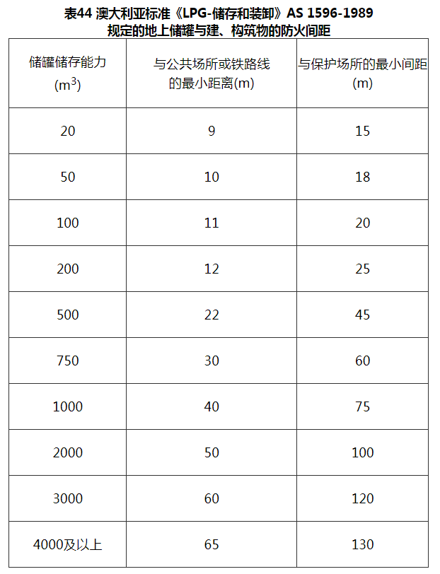2)澳大利亚标准《LPG-储存和装卸》AS1596-1989规定的地上储罐与建、构筑物的防火间距见表44。