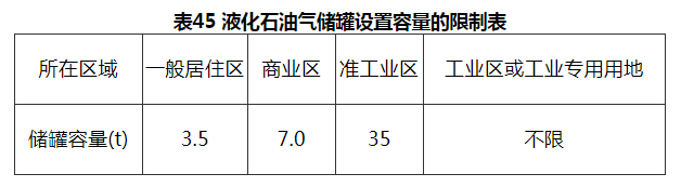 第一类居住区(指居民稠密区)严禁设置液化石油气储罐,其他区域对储罐容量作了如表45的规定。
